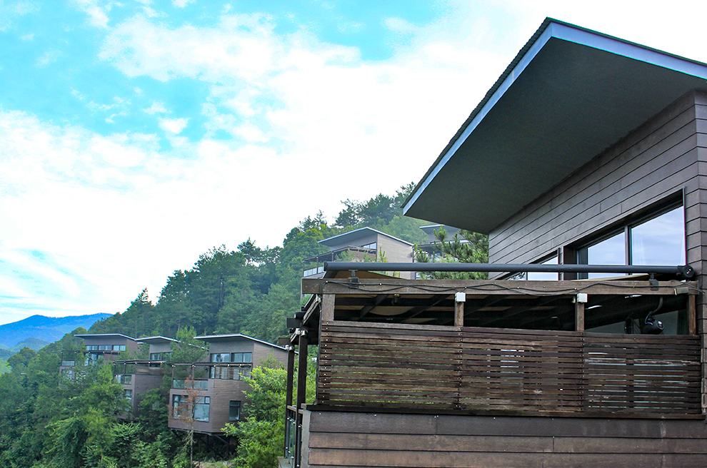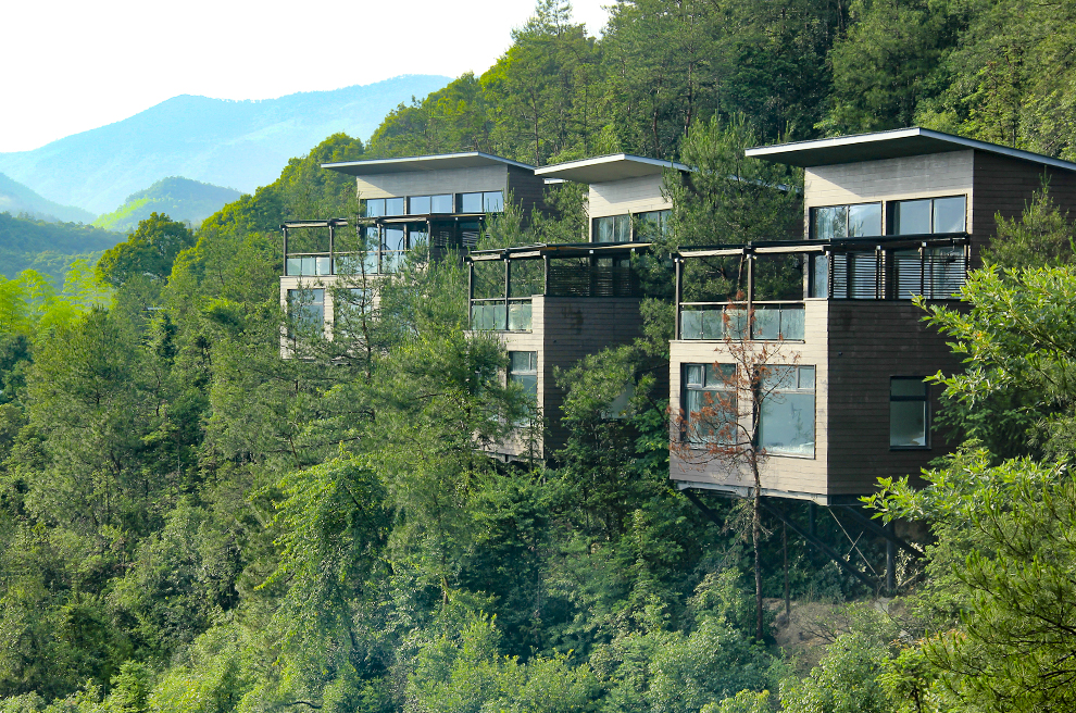 浙江莫干山裸心谷度假村,占地300亩,于2011年开业,拥有121间客房,包括树顶别墅、夯土小屋两种房型,是中国荣获国际LEED绿色建筑珀金级认证的生态度假村。
