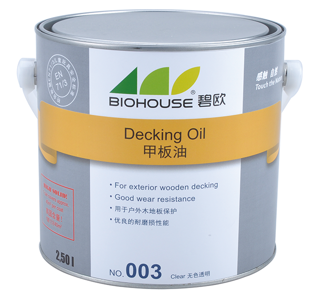 Biohouse Decking Oil is a wood finishing oil for protecting outdoor wooden decking, terrace or patio. It is also ideal for treating other outdoor timber such as exterior wall panel, garden furniture, summerhouse, and fencing, etc. BiohouseDecking Oil is excellent in weather resistance. The oil penetrates deeply into wood and provides excellent water-resistant and dirt repellent surface. It will not crack or peel over long period. For future renovation, no sanding is necessary. Just apply a new coat. Biohouse Decking Oil can also be used as topcoat over outdoor satins, for example Biohouse tinted Clear Oil, as a protective layer above.